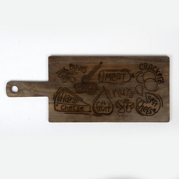 Our XL Mango Wood Charcuterie Board dedicates a spot for all the staple snacks. Whether it's for a seasoned host or amateur chef, this serving board makes a lovely gift! Board measures 37.75L x 15.5W x 0.75H in. Crafted of mango wood Natural wood grain finish Features snack-themed text Food safe Care: Hand wash only. Do not immerse in water. Contact your local Kirkland's store for availability. Quantities and selection may vary by location.