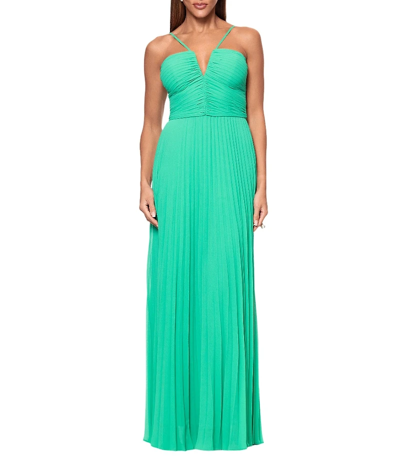 From Xscape Petite, this dress features: Chiffon fabrication A-line silhouette Split V-neckline Sleeveless Pleated detail Lined Back zipper closure Approx. 60.5" length Polyester Dry clean Imported.
