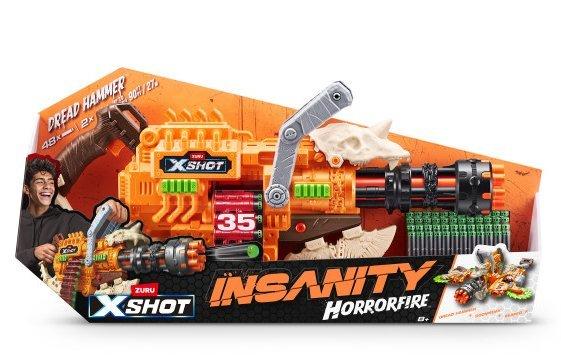 XSHOT Insanity HorrorFire Dread Hammer, is the biggest, the baddest, the most Next Level blaster in the Insanity HorrorFire range! Featuring a 35 dart clip, your ready to take on anything a blaster battle has to throw at you! Including 48 Air Pocket Technology darts for precise shots with up to 30m/98 feet range! Combine the entire Insanity HorrorFire range for insane combo blasters!