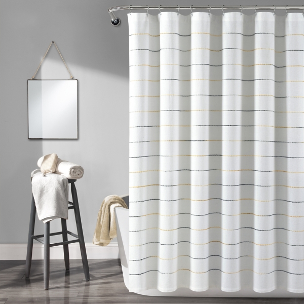 Update your bathroom in simple yet chic style with this Yellow and Gray Ombre Stripe Shower Curtain! The warm yellow hues will subtly brighten up your bathroom! Shower curtain measures 72L x 72H in. Crafted of cotton and polyester Horizontal ombre stripe design Hues of white, gray, and yellow Perforations for shower curtain hooks; hooks not included Care: Machine wash cold separately with similar colors. Delicate cycle. Use only non-chlorine bleach if needed. Dry clean recommended. This item is available at Kirklands.com only, not available in stores. Please note: this item cannot be shipped to APO/FPO addresses.