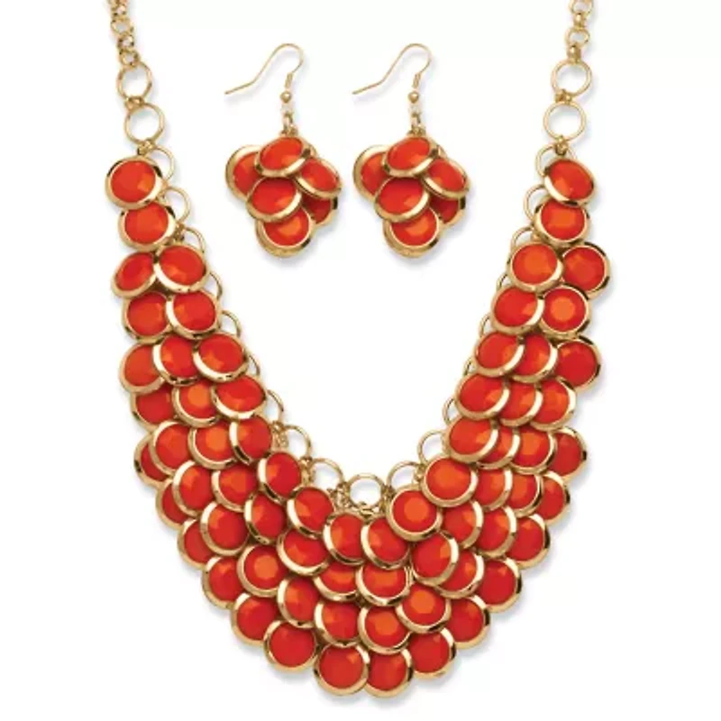 Be on trend with this statement bib necklace in sensational yellow and yellow gold tone. For a striking and stylish look, pair it with the matching earrings to complete the ensemble. For the woman who is looking for a visual feast. Necklace is adjustable 18" -21".108 Simulated LuciteGoldtoneEarrings: 19 mm wide x 49 mm long x 19 mm high; Necklace: 65 mm wide x 18 inches long x 3 mm high, plus 3 inch extensionIncludes gift box and drawstring pouchGoldtoneEarrings Dimensions: 19 mm wide x 49 mm long x 19 mm high, Necklace Dimensions: 65 mm wide x 18 inches long x 3 mm high, plus 3 inch extensionIncludes gift box and drawstring pouch 3 Lobster closure, 108 Polished finish Warranty available China Imported Product Specifications 2.68 in x 18 in x 2.56 in, 18" length Material & Care Gold-Tone Metal, Gold-Tone Clean with a soft cloth.
