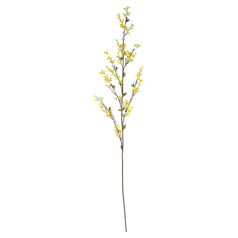 A stem gives way to tiny shoots and delicate, wispy yellow flowers on this artificial forsythia flower. The realistic stem stands at 55" and features lifelike offshoots. Pair this set with a black vase to accentuate their bright yellow color. Place this set of 3 in a smart black vase to accent their yellow color, or pair them with a rich green faux leaf in a neutral-colored vase. Item may need to be re-shaped when removed from box.Details:Yellow3" x 6" x 55"3 piece setFor indoor use onlySynthetic