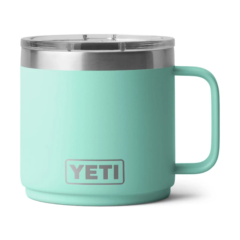 Stay hydrated on the go with the YETI Rambler 14 oz. Stackable Mug. Its 18/8 kitchen grade stainless steel construction enhances durability. The DuraSip™ ceramic lining and double-wall vacuum insulation to keeps cold drinks cold and hot drinks hots, and its splash-resistant Magslider lid provides protection. Remove the lid and nest your Rambler® Mugs to save space.