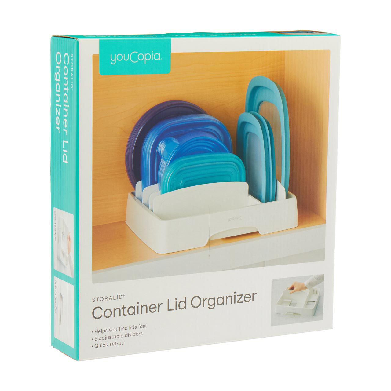 Measuring just the right size to fit inside standard kitchen cabinets, the Storalid Container Lid Organizer comes with five adjustable dividers that can be customized to accommodate lids of various shapes and sizes. Whether you have round, square, or rectangular lids, this organizer adjusts to your needs, making it simple to find the right lid fast.