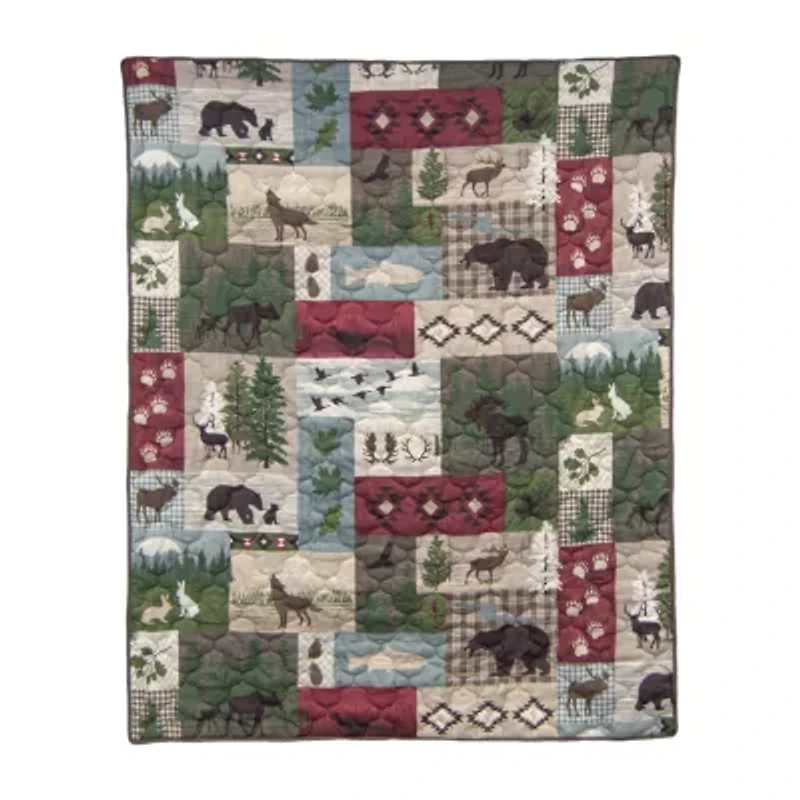 The Montana forest lodge throw by donna sharp a delightful design that will transport you to the heart of nature's playground. This rustic throw blanket boasts an enchanting patchwork pattern adorned with a variety of wildlife and pine motifs, bringing the wilderness into your room with a playful twist. Embark on a journey into the animal kingdom where bears, moose, rabbits, elk, geese, pheasants, deer, and fish frolic amidst the Montana forest inspired design. The color palette of this design is a symphony of earthy tones and rich hues. From the serene ivory and oatmeal to the grounding taupe and slate blue, and the vibrant pops of vineyard green, olive green, mocha, dark brown and port wine, this collection captures the essence of a Montana forest tranquil, invigorating, and full of life. 100% microfiber, machine wash cold, do not bleach, tumble dry low. Dimensions: 50" x 60".