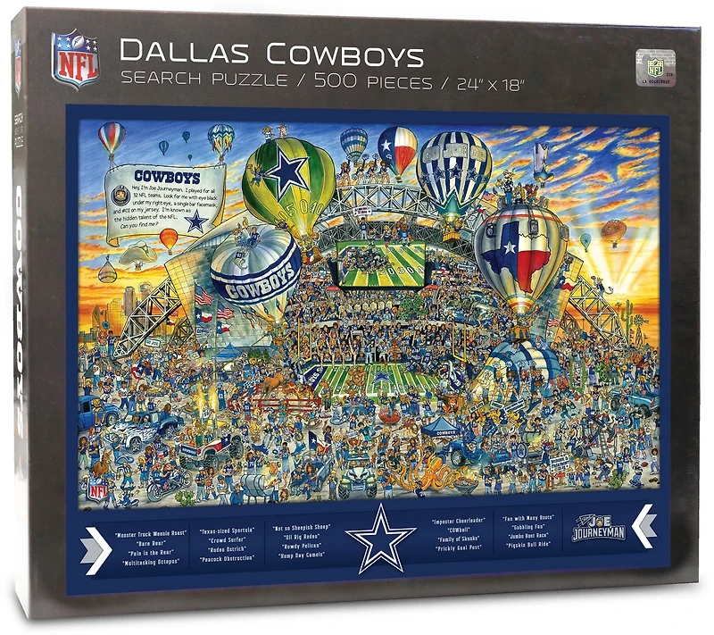 You'll have fun with family, friends, and fellow Boys fans with the YouTheFan Dallas Cowboys Joe Journeyman 500-Piece Puzzle. The puzzle features engaging hand-drawn illustrations that showcase your team's stadium, fans and more. Once the puzzle is assembled, it's time to search for fun seek-and-find scenes and Joe Journeyman, the only individual who's played on every team in the league.