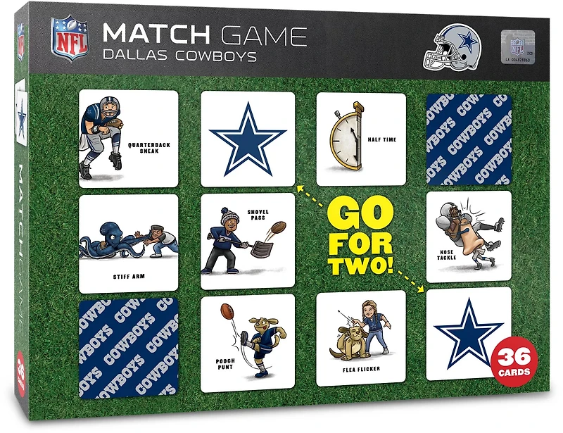 Show your support for the Cowboys with the YouTheFan Dallas Cowboys Memory Match Game. This memory match game provides fun for the whole family. It comes with 36 cards that feature matching Cowboys team specific illustrations to show your team spirit while you play.