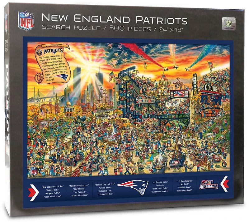 You'll have fun with family, friends, and fellow Pats fans with the YouTheFan New England Patriots Joe Journeyman 500-Piece Puzzle. The puzzle features engaging hand-drawn illustrations that showcase your team's stadium, fans and more. Once the puzzle is assembled, it's time to search for fun seek-and-find scenes and Joe Journeyman, the only individual who's played on every team in the league.