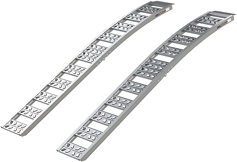 Load ATV, riding lawn mowers and more with the Yutrax 90 in Folding Arched Ramps. The arched design helps prevent bottoming out, while the wide-rung design allows for smooth loading. The ramps are made of extruded aluminum for durability, and they have an embossed rung design for traction when loading and unloading.