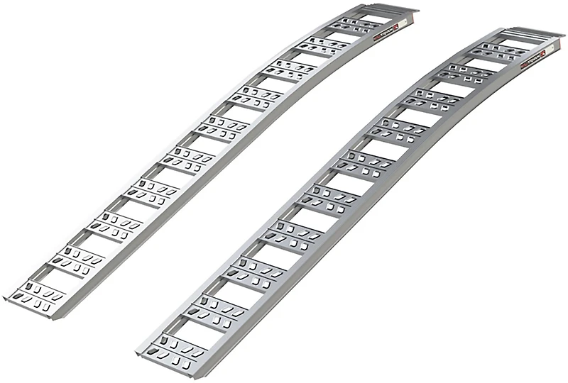Load ATV, riding lawn mowers and more with the Yutrax 90 in Heavy Duty Arched Ramps. The arched design helps prevent bottoming out, while the wide-rung design allows for smooth loading. The ramps are made of extruded aluminum for durability, and they have an embossed rung design for traction when loading and unloading.