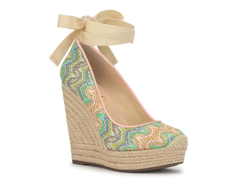 The Zexie espadrille wedge sandal from Jessica Simpson brings a fresh, spirited vibe to your warm-weather wardrobe. With its embroidered raffia upper and wraparound ankle tie, this sandal offers a playful yet polished silhouette that transitions effortlessly from weekend errands to evening outings. The round toe and towering espadrille wedge heel create a bold statement, perfect for adding a touch of city-casual flair to any outfit.