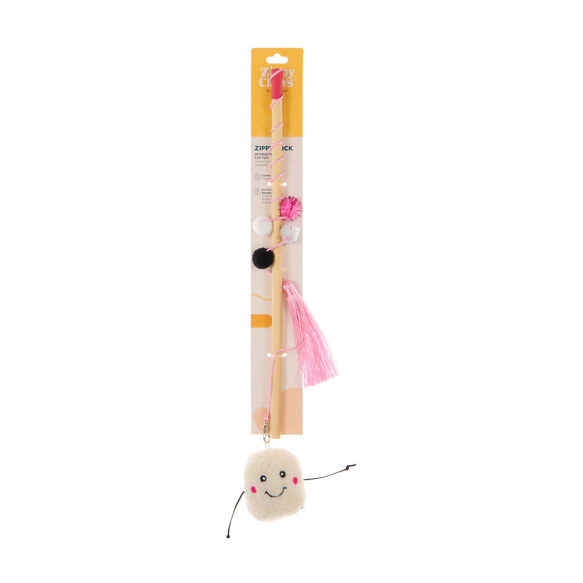 The Zippy Stick is a lightweight, interactive cat toy that consists of a soft, plush marshmallow-shaped character with a cute, smiling face that's sure to charm both you and your pet. Attached to the marshmallow is a vibrant pink tassel that adds an extra element of playfulness and movement to catch your cat’s eye.