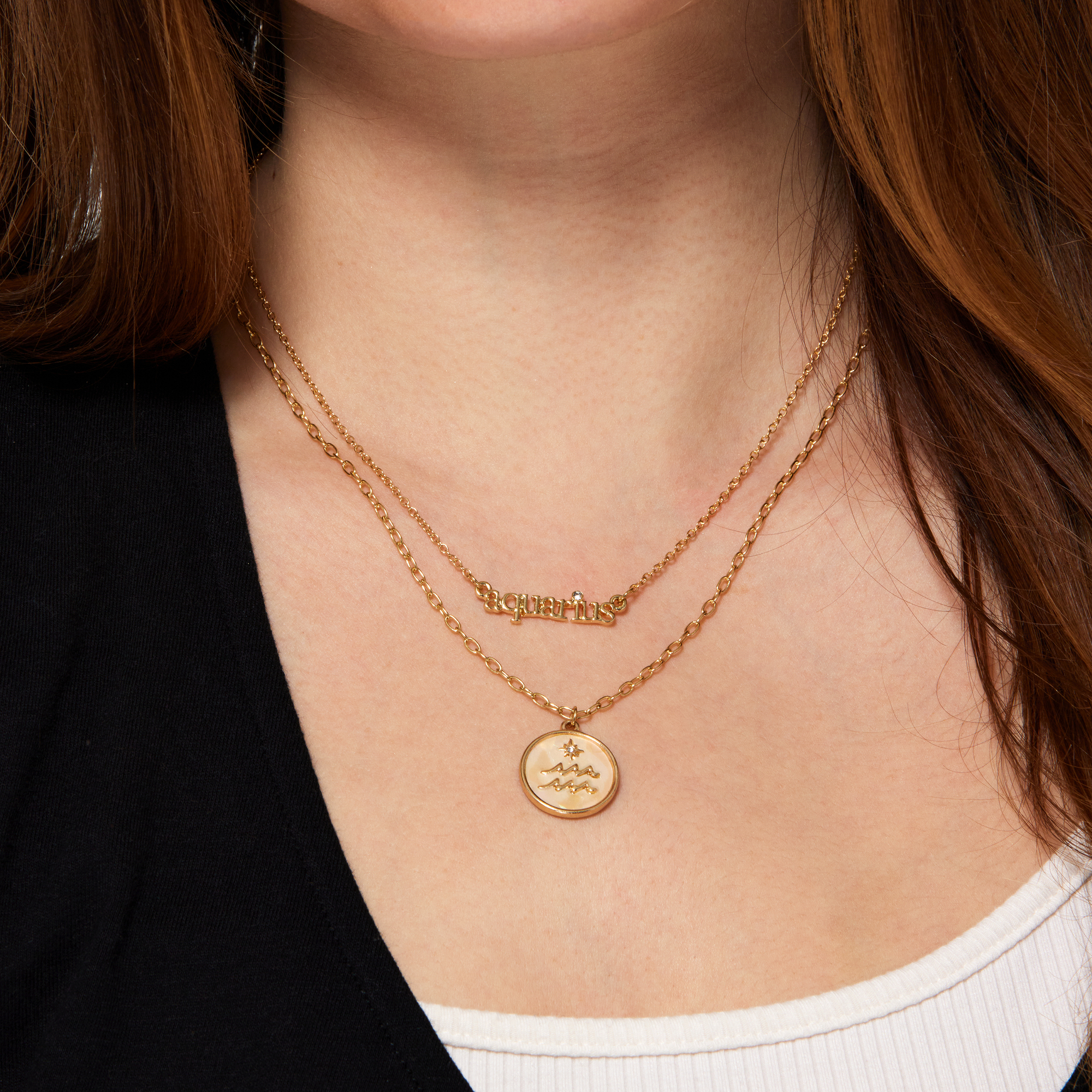 - it's written in the stars: everyone will love the zodiac layered necklace!! this adorable style features a script pendant of your star sign & a matching coin pendant.