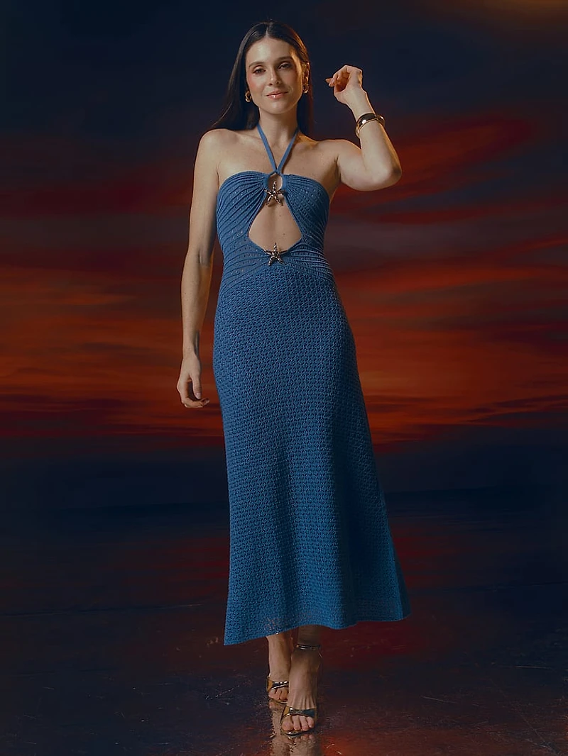 A halter-style crochet Maxi Dress, featuring an elegant cutout accented with dazzling star charms that catch the light of the summer sun. It's your elevated, vacation-ready statement piece that blends artisanal craftmanship with modern femininity.