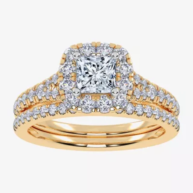 G / Vs2-Si1) Womens 1 CT. T.W. Lab Grown White Diamond 10K Gold Cushion Side Stone Halo Bridal Set