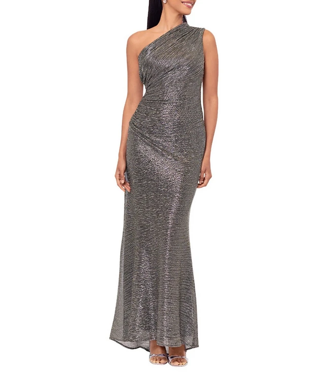 Adrianna Papell Metallic Ruffle Neck One Shoulder Printed Crinkle Gown