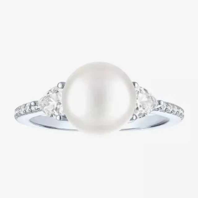 Womens 9-9.5MM White Cultured Freshwater Pearl Sterling Silver Round Side Stone Cocktail Ring