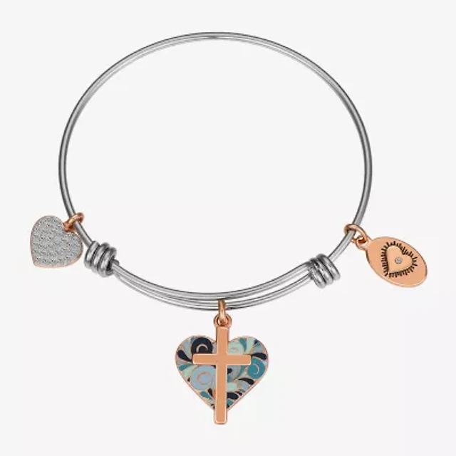 Footnotes Faith Womens Cubic Zirconia Stainless Steel Cross Heart Bangle Bracelet