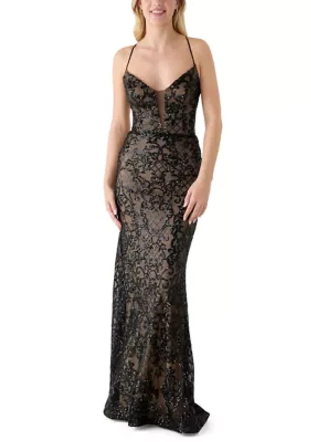 Next Up Drape Neck Illusion Corset Satin Long Dress