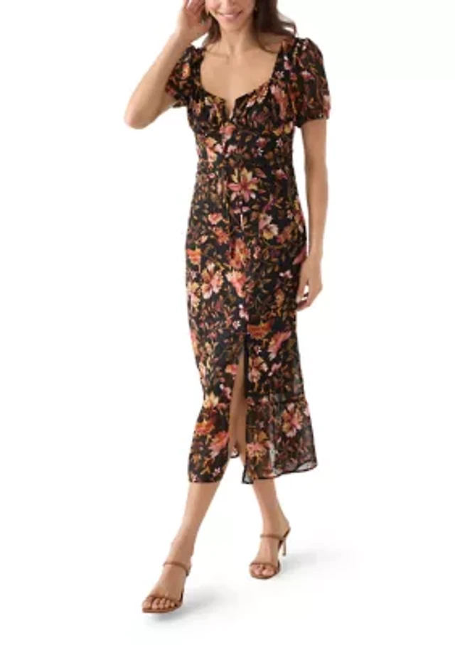 Women's Puff Sleeve Smocked Swirl Print Midi Dress