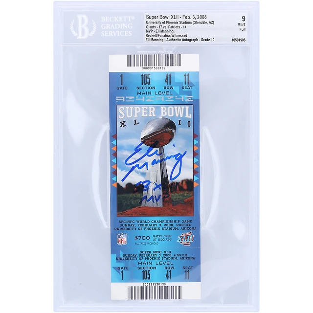Eli Manning New York Giants Autographed Super Bowl XLII Beckett Fanatics Witnessed Authenticated Auto 10 Ticket from February 3, 2008 with "SB XLII MVP" Inscription