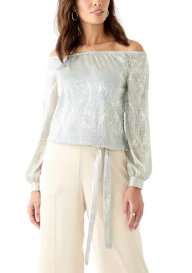 Petite Puff Sleeve Printed Off the Shoulder Top