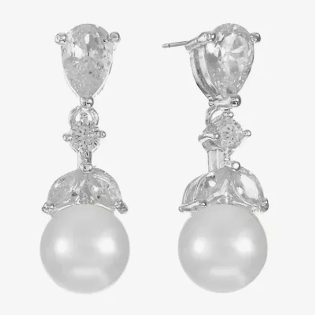 Silver Treasures Womens White Simulated Pearl Sterling Silver Drop Earrings