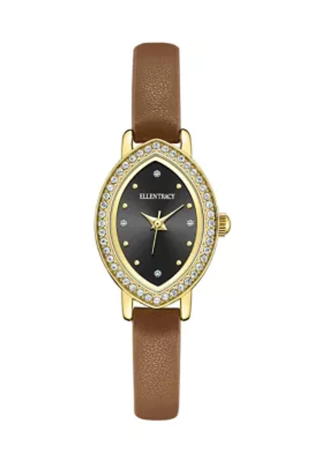 Gold Tone Crystal Marquise Brown Strap Watch