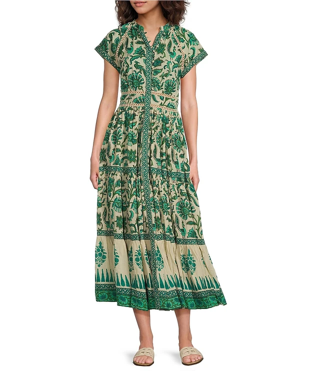 KUT from the Kloth Maxi Point Collar V-Neck Cap Sleeve Light Wash Tiered Denim Maxi Dress