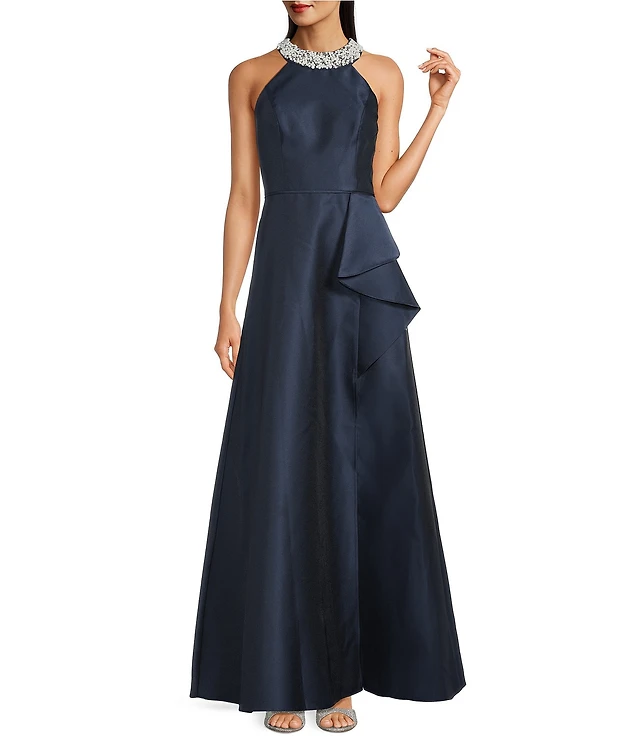 Adrianna by Adrianna Papell Stretch Satin Halter Neck Sleeveless Front Opening Sheath Gown